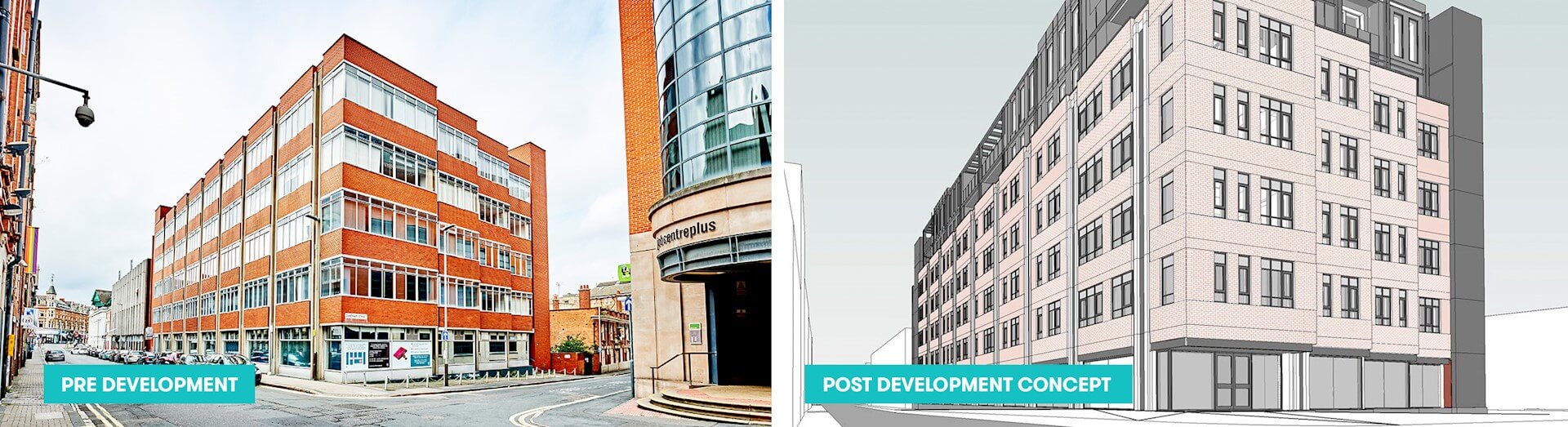 The collaboration between the asset management and development teams helped generate significant value and created a successful and profitable outcome for Wellington House in Leicester. Due to a challenging local office market, only 20% of the space was let, which subsequently led to high void costs, and as a result FI identified that an alternative use would provide a better return on investment.
